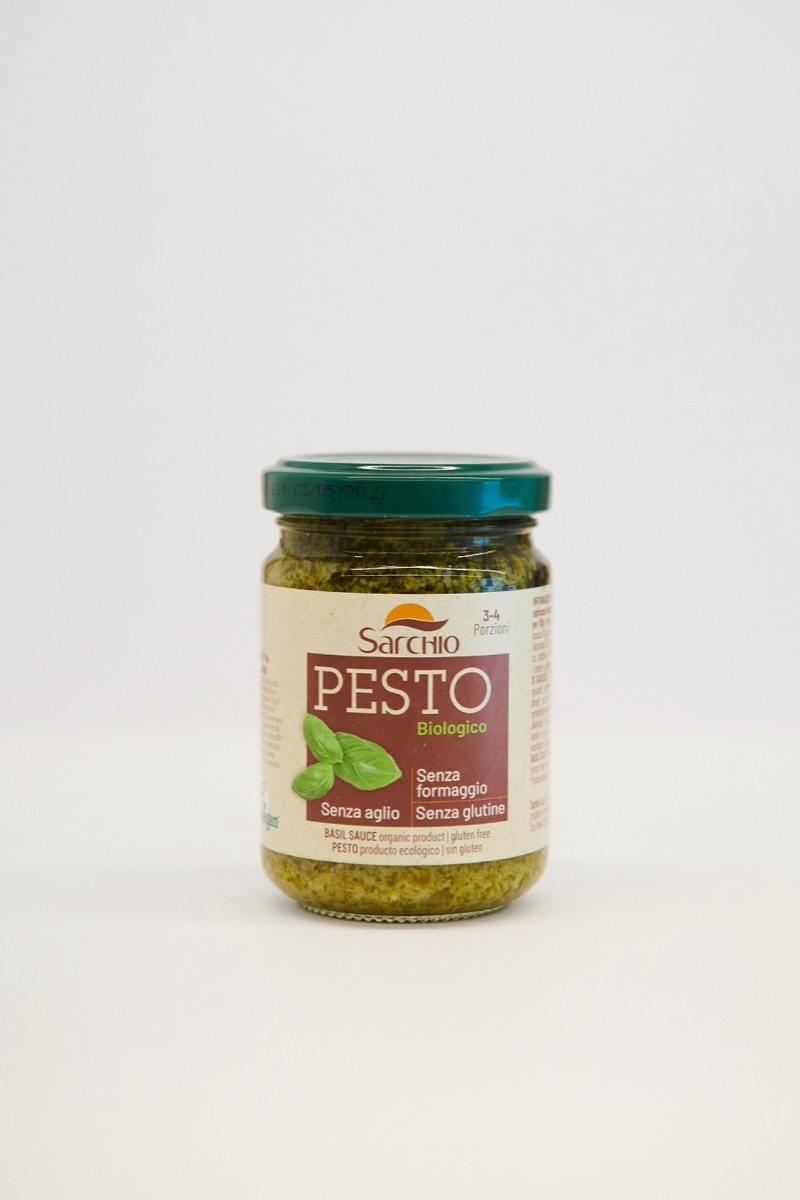 Ingredientes: albahaca (55 %), aceite de semillas de girasol, copos de patata, aceite de oliva virgen extra, piñones, sal marina, zumo de limón. *Todos los ingredientes procedentes de la agricultura ecológica.
